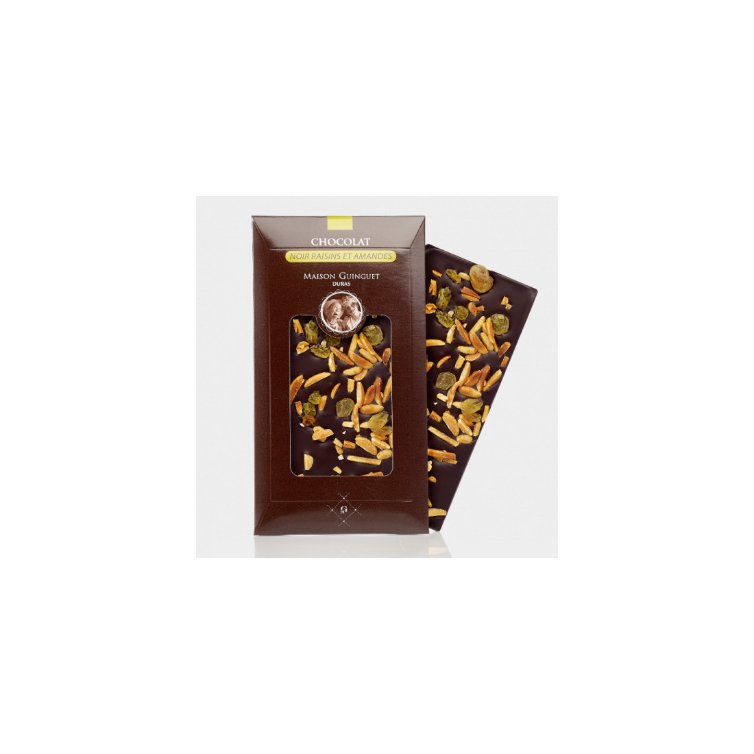Liste des ingrédients : Masse de cacao, sucre, beurre de cacao, raisins 7 %, amandes 4,9 %, huile de tournesol, arôme naturel de vanille, émulsifiant : lécithine de soja.